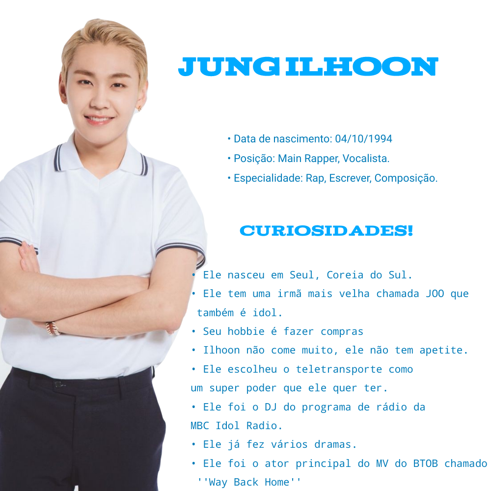 Sua música de debut foi "비밀 (INSANE)" do mini-album "Born to Beat", o grupo possui duas unit oficial (BTOB-BLUE e BTOB 4U) e seis solos (Ilhoon, Changsub, Minhyuk, Peniel, Hyunsik, Sungjae). Atualmente sua música mais conhecida é Missing You, mas você pode conhê-los por WoW também.